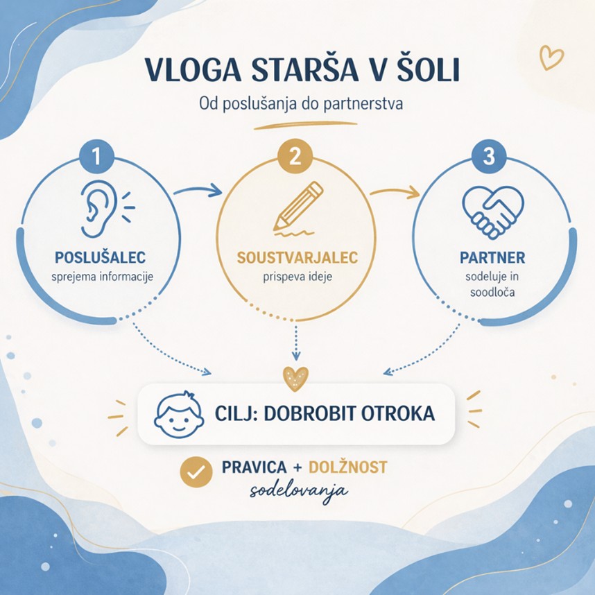 Sodelovanje med šolo in starši presega posamezne govorilne ure in roditeljske sestanke. Gre za odnos, ki se gradi postopoma in zahteva aktivno vlogo obeh strani. Takšno sodelovanje ni prepuščeno naključju ali osebni izbiri, temveč je opredeljeno tudi na ravni zakonodaje, ki staršem daje pravico in dolžnost sodelovati pri izobraževanju svojega otroka. Prav v tem odnosu otrok doživlja, da odrasli okoli njega sodelujejo, ga razumejo in ga podpirajo na njegovi poti učenja.