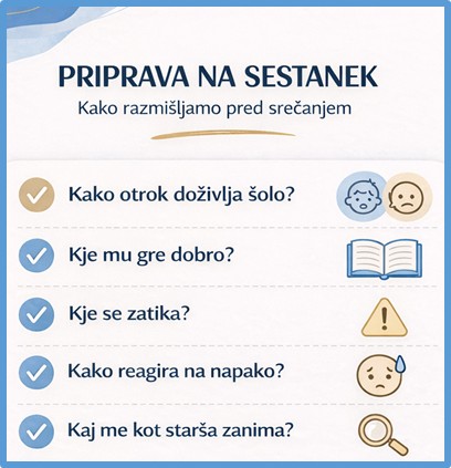 Starši na govorilne ure in roditeljske sestanke vstopamo kot soustvarjalci otrokove poti. Šola in dom sta dva prostora, ki se morata povezovati, če želimo, da otrok napreduje v znanju, v samozavesti, odnosih in odgovornosti. Sodelovanje med šolo in starši dokazano vpliva na uspešnost in dobrobit otroka, zato ima naš prihod na govorilne ure in roditeljske sestanke jasno vlogo in smisel (Grafenauer Ekart idr., 2022).