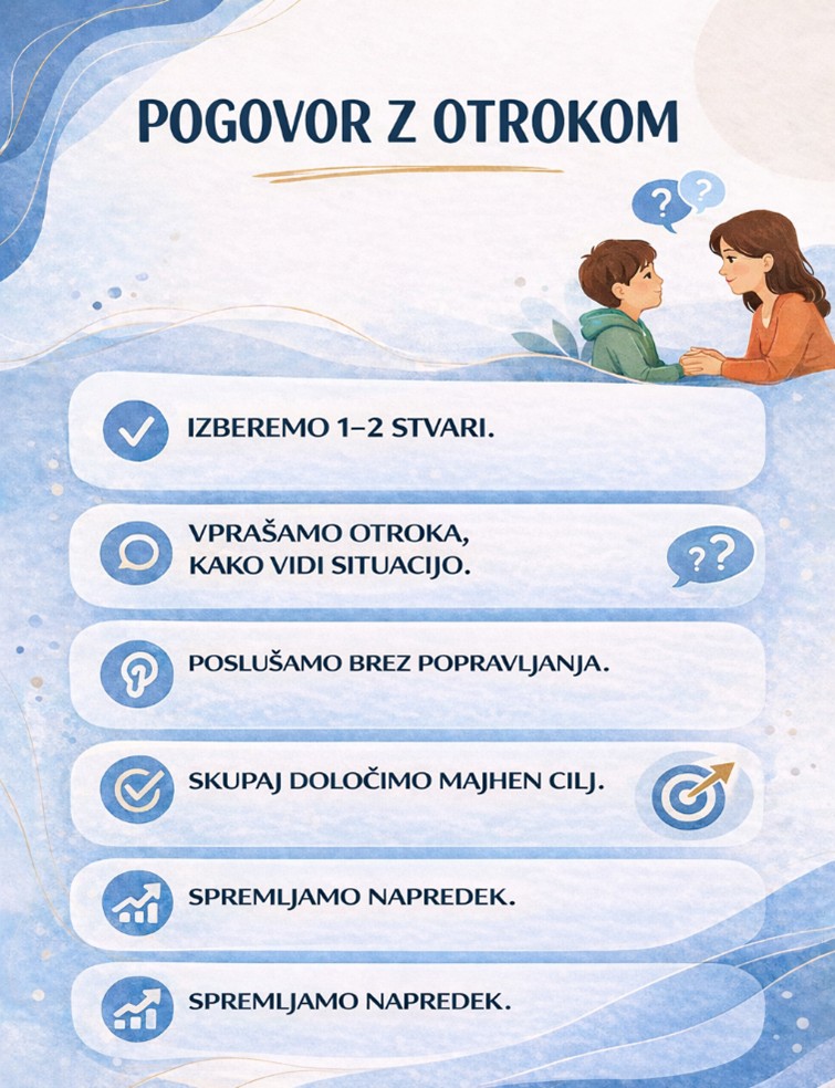 Ko se vrnemo iz govorilne ure ali roditeljskega sestanka, je ključno, da informacije pretvorimo v konkretna dejanja. Doma si zapišemo eno ali dve stvari, ki jih bomo spremenili. Z otrokom se pogovorimo tako, da ga vključimo. Ne povemo, kaj je bilo rečeno, ampak ga vprašamo, kako on vidi situacijo. Nato skupaj določimo en majhen cilj. Na primer, da začne z nalogo sam ali da dokonča začeto delo. Tak pristop temelji na formativnem spremljanju, kjer je poudarek na majhnih korakih napredka in sprotnem spremljanju (Novak, 2018).