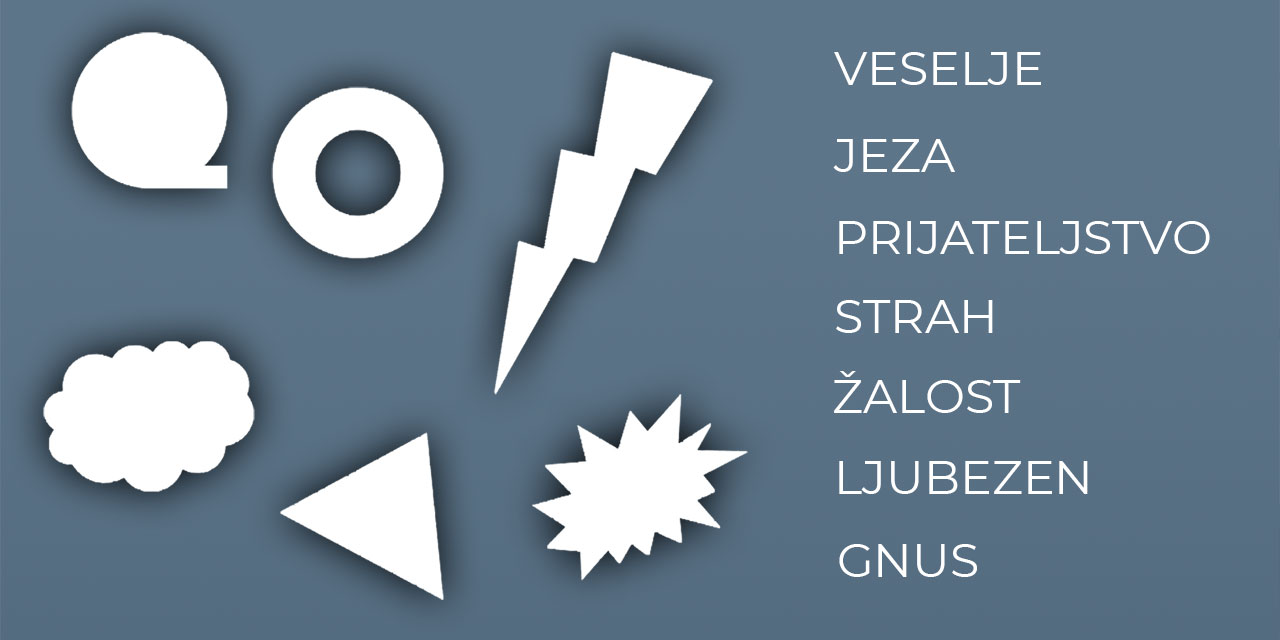 Na podlagi teh izkušenj smo izvedli aktivnost, kjer so učenci oblike povezovali z besedami, ki so predstavljale različna čustva, ter svoj izbor utemeljili (Slika 1). Primeri njihovih razlag: »Obliko obroča sem povezala z besedo ljubezen, saj je ljubezen nekaj neskončnega in povezanega« ali »Obliko strele sem povezal z jezo, ker je koničasta kot nož.« Aktivnost je pokazala, kako pomemben je kontekst opazovalca, saj so učenci iste oblike povezovali z različnimi čustvi.