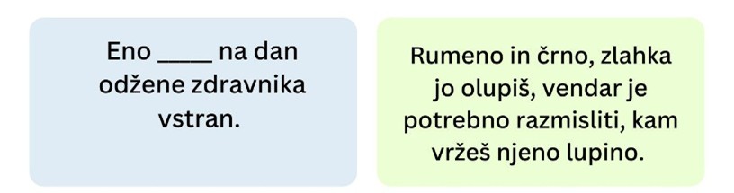 - Eno _ na dan odžene zdravnika vstran. (jabolko)