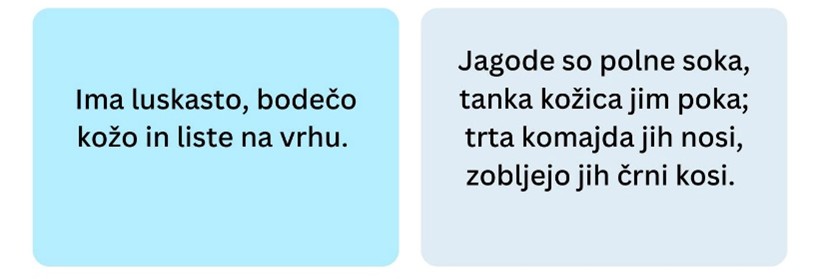 - Jagode so polne soka, tanka kožica jim poka; trta komajda jih nosi, zobljejo jih črni kosi. (grozdje)