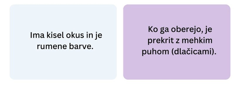 - Ko ga oberejo, je prekrit z mehkim puhom (dlačicami). (breskev ali kivi)