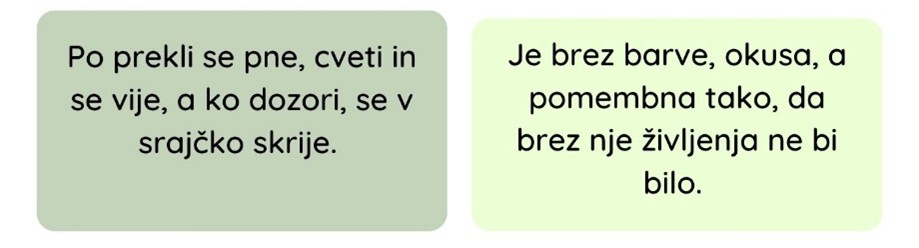 - Je brez barve, okusa, a pomembna tako, da brez nje življenja ne bi bilo. (voda)