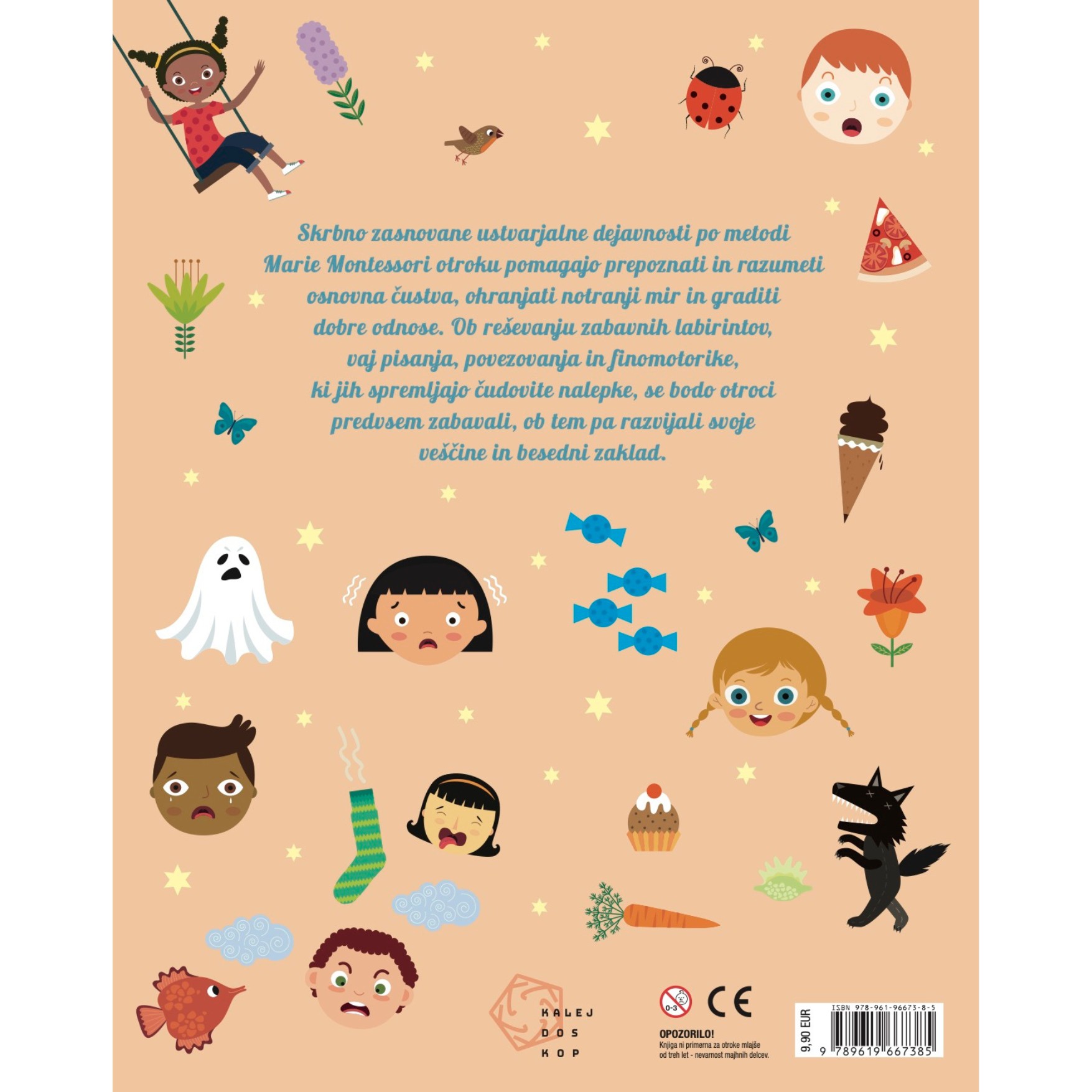 Kako otroku pomagamo prepoznati in razumeti čustva, ter se naučiti njihovega obvladovanja, kot pravi deskarji na valovih? Čudovita knjiga z nalepkami vsebuje ustvarjalne dejavnosti po metodi montessori, ob katerih bodo otroci spoznavali osnovna čustva in krepili svoj notranji mir, ob tem pa razvijali tudi svoje finomotorične spretnosti in besedni zaklad, ter se predvsem zabavali. Knjiga je namenjena otrokom starim 5-7 let, njena vsebina pa bo gotovo navdušila tudi mlajše otroke in odrasle.