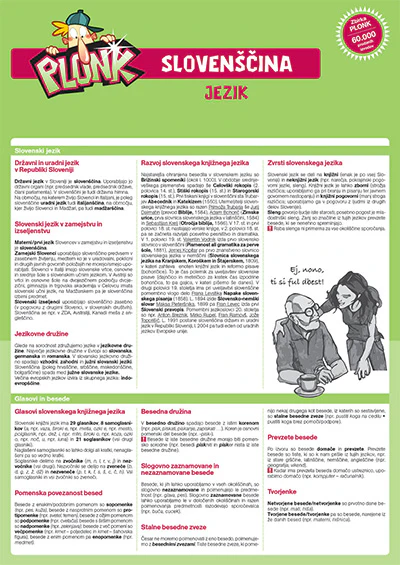 Preglednica Osnovnošolski PLONK Slovenščina - jezik je namenjen osnovnošolcem za utrjevanje in hitro iskanje informacij pri učenju slovenščine. Vsebuje pregled vseh jezikovnih tem, ki se obravnavajo v osnovni šoli.