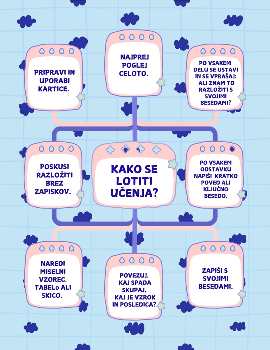 Uporabna strategija so kartice. Na eno stran zapiše pojem, na drugo razlago v svojih besedah. Tak način omogoča hitro preverjanje razumevanja in ponavljanje. Za starše je pomembno, da spodbujajo razlago, ne prepisovanja definicij. Če otrok zna pojem razložiti, pomeni, da ga razume. Če ga zna le ponoviti, razumevanje še ni vzpostavljeno.