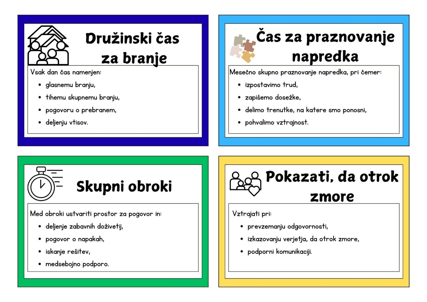 Branje je ena temeljnih veščin za uspeh pri vseh šolskih predmetih, zato je družinski čas za branje izjemno pomembna navada. Ko starši vsak dan namenimo vsaj nekaj minut skupnemu branju, otroku posredujemo močno sporočilo o vrednosti znanja. Redno branje izboljšuje besedišče, razumevanje besedil in sposobnost koncentracije. Poleg tega krepi domišljijo in ustvarja pozitiven odnos do knjig, ki pogosto ostane prisoten tudi v odrasli dobi.