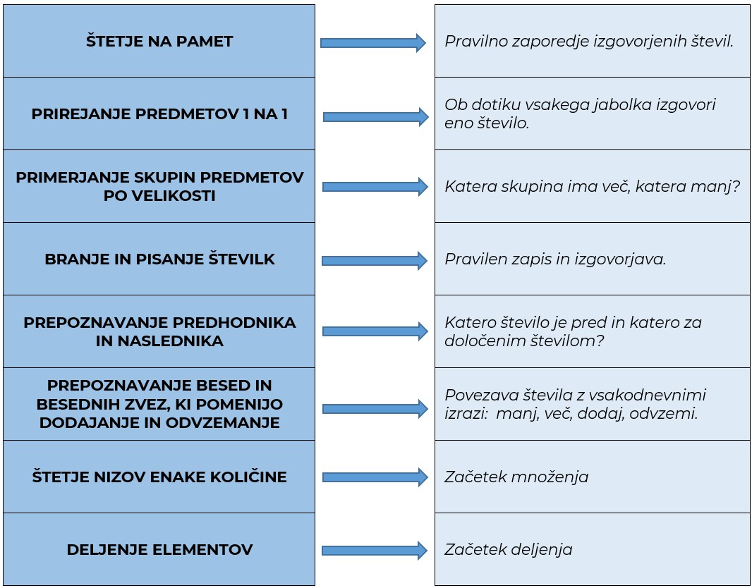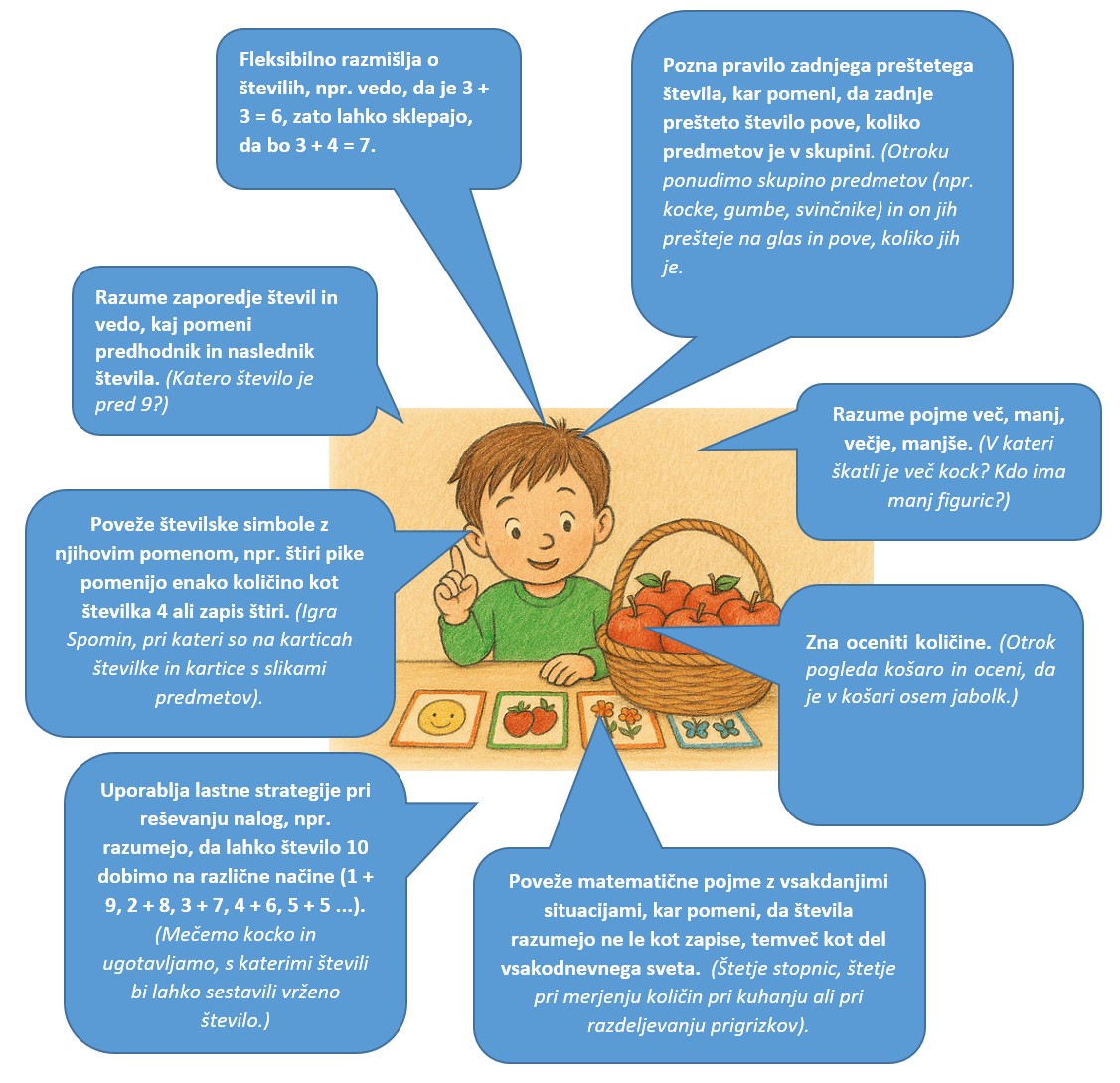 Kot poudarja Lipovec (2013), učenje pojmov v matematiki poteka skozi tri ravni: konkretno, slikovno in simbolno. Zato otroku najprej pomagajmo, da pojme začuti in ponazori, šele nato jih zapiše ali računa. Otrok že pred vstopom v šolo prešteva predmete: jabolka, stopnice, igrače. Otrokovo igro s štetjem lahko podpremo z izzivi štetja naprej in nazaj; na sprehodu lahko štejemo v gibanju, na primer: »Skoči desetkrat, potem petkrat nazaj.« Modele bankovcev in kovancev, ki jih lahko sami izdelamo, lahko uporabimo pri igri trgovine, v kateri otrok razvršča kovance, primerja vrednosti in plačuje z »igralnim denarjem«. Tako razvija razumevanje števil, zaporedij in merskih enot na zabaven, življenjski način.