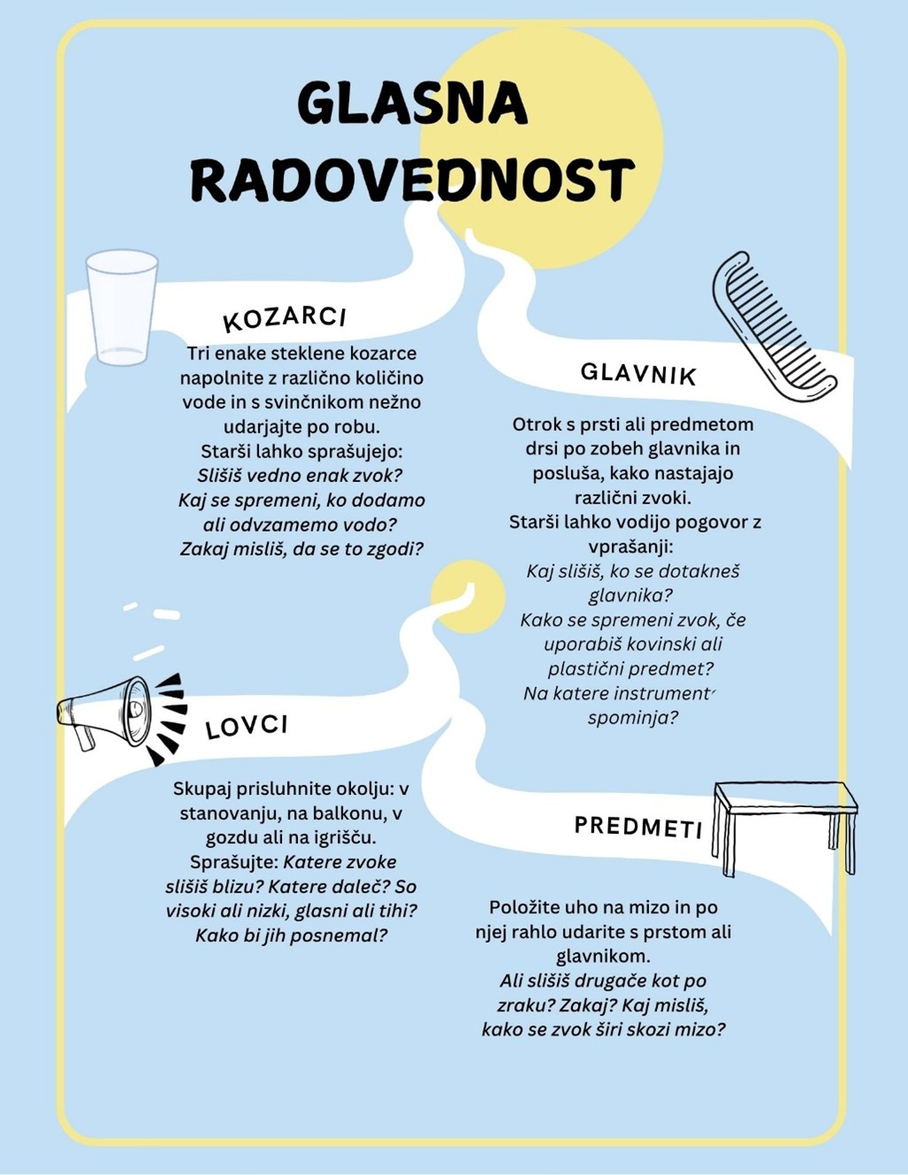 Nevodena ali prosta igra je dragocen čas, v katerem otrok svobodno preizkuša svoje ideje. Igra z naravnimi materiali, vloga “majhnega raziskovalca” v naravi ali preprosti poskusi s svetlobo, vodo in zvokom so dejavnosti, ki gradijo raziskovalne spretnosti. Doma lahko skupaj preizkusimo: …