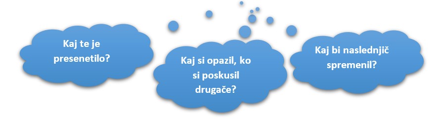 Kaj si opazil? Kaj bi lahko naredil drugače? Kaj misliš, zakaj se je tako zgodilo? - Kako otrok pripoveduje o tem, kar je odkril?