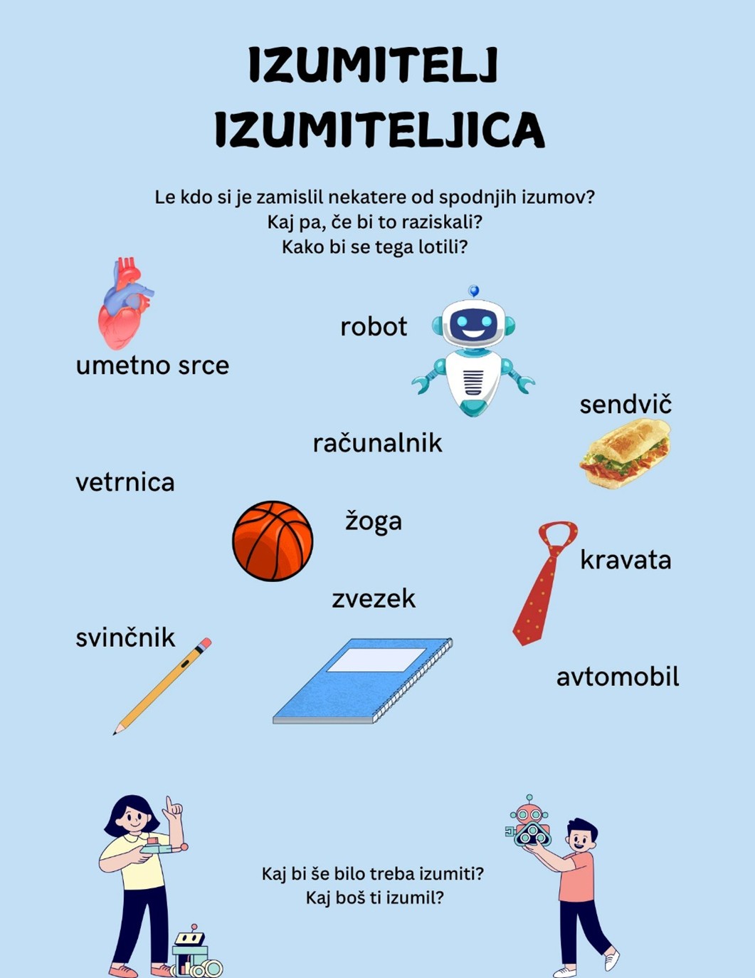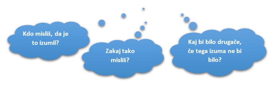 Dejavnost lahko izvedemo kot pogovor, skupno raziskovanje ali branje. Izberemo lahko nekaj izumov s seznama (npr. žoga, avtomobil, robot, svinčnik) in otroku zastavimo vprašanja: