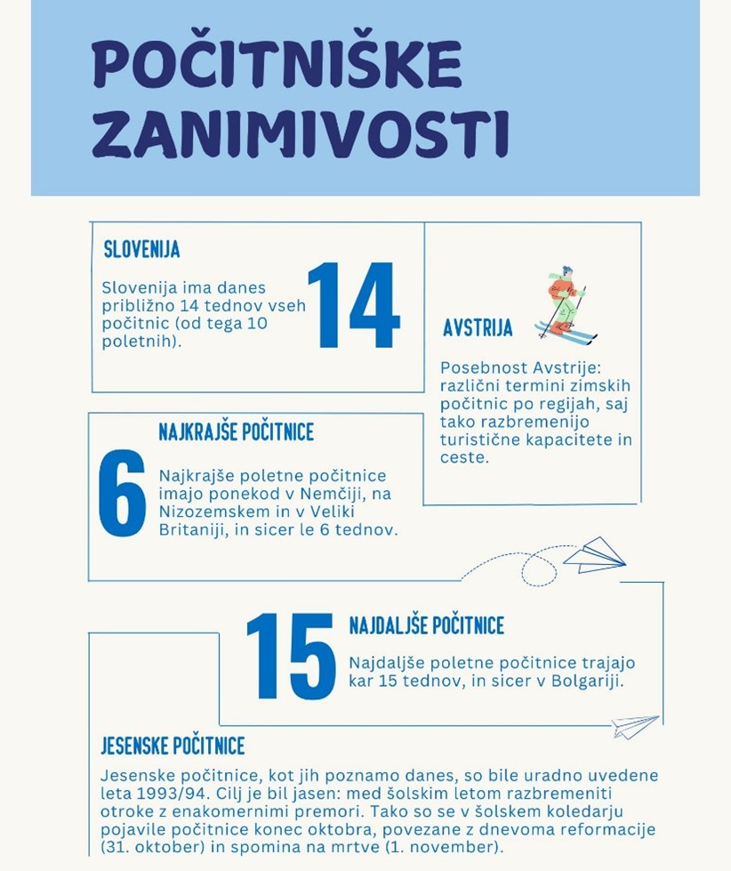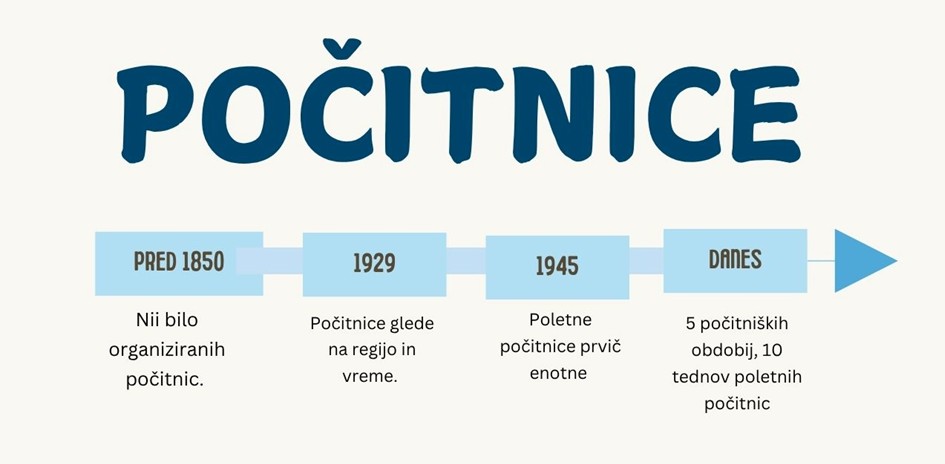 Ko danes starši slišimo besedno zvezo šolske počitnice, pomislimo na čas oddiha, prostih dni in načrtovanja družinskih izletov. A nekoč počitnic v današnjem pomenu sploh ni bilo. Pred uvedbo obveznega šolanja je bilo šolskih dni malo, počitnic pa še manj, saj so bili otroci tudi del delovne sile na kmetijah. Šola se je v celoti prilagajala vremenu, letini in opravilom na polju. Šolske počitnice danes razumemo kot čas oddiha od učenja, namenjen prostočasnim dejavnostim in počitku. To je čas, ki je s šolskim koledarjem vnaprej določen.