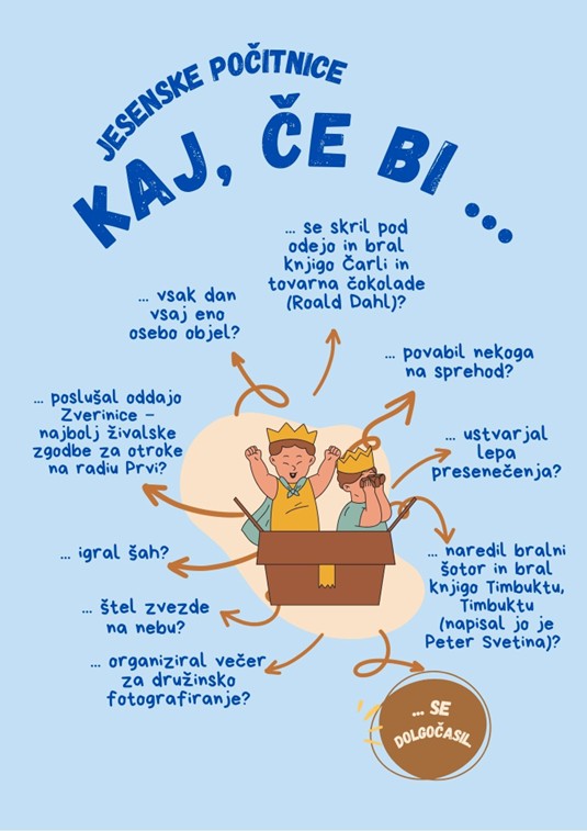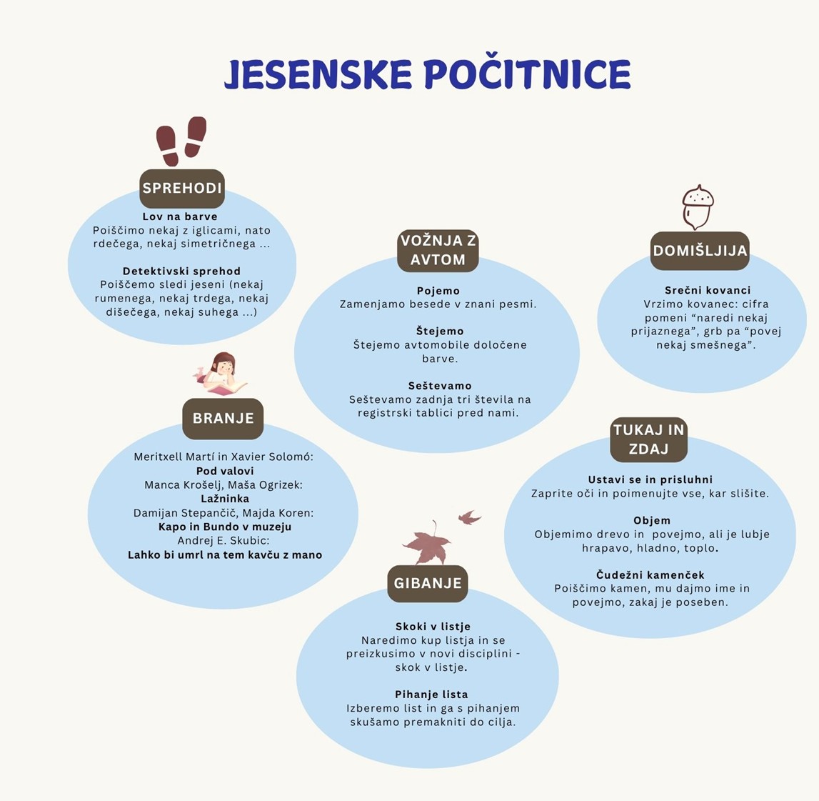 Jesenske počitnice ponujajo številne možnosti za kakovostno preživljanje prostega časa z otroki. Skozi skupen čas lahko spontano in neobvezujoče vključujemo tudi ponavljanje ter utrjevanje šolskih vsebin. Vključujejo naj gibalne in čutne izkušnje ter dejavnosti, ki spodbujajo domišljijo, ustvarjalnost in čuteče doživljanje narave.