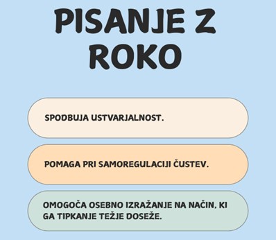 Najpomembnejše: dajmo otroku čas. Pisava se razvija počasi, šele med 12. in 14. letom se pisanje popolnoma avtomatizira. Čeprav digitalne spretnosti postajajo vse pomembnejše, učenja pisave ne moremo kar opustiti, saj pisanje z roko ni zgolj način komunikacije, temveč tudi pomembna vaja za možgane in razvoj fine motorike. Povezuje oko, uho in roko, krepi spomin in koncentracijo ter otrokom pomaga razumeti razmerje med glasom, obliko in pomenom črke. Poleg tega rokopis spodbuja ustvarjalnost in osebni izraz, omogoča hitrejše zapisovanje misli in predstavlja kulturno vez z zgodovino in identiteto. Finska, ki je leta 2015 odpravila obvezno učenje pisane pisave, pisanja z roko ni popolnoma opustila, in otroci še vedno uporabljajo tiskane črke in razvijajo ročne spretnosti skozi različne ročnodelske in ustvarjalne dejavnosti. Tak pristop kaže, da tipkanje res pridobiva pomen, vendar pisanje z roko ostaja nujen del izobraževanja, saj zgolj tipkovnica ne more nadomestiti vseh koristi, ki jih prinaša pisana pisava.